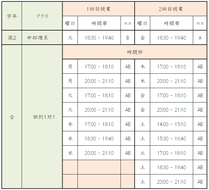 ●高1は個別指導のみとなっております。●高3は特殊時間割となり個別でお知らせしております。●祝日も授業があります。●月曜日~土曜日まで、専任講師2名が常駐しています。●授業がない日も自習室は自由に利用できます。●授業がない時間帯はいつでも質問対応を行います。