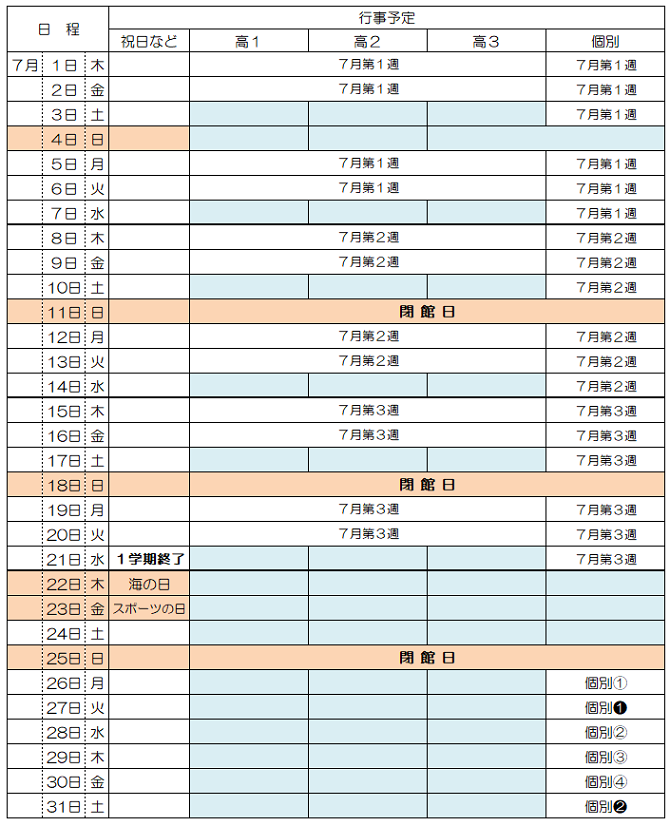 ※7月は2週の予定でしたが、学校の授業進度の関係により3週にいたします。