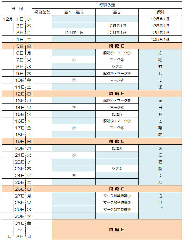 ※12/6~12/30までの開館時間は、同封してある冬期講習時間割の裏面に掲載してあります。