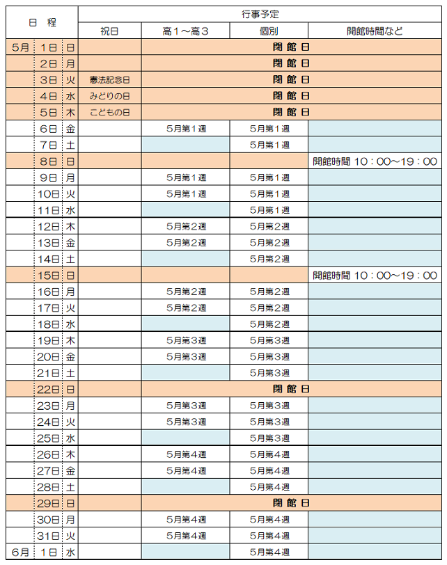 ※ 5月第1週は「4/28(木),5/6(金)~11(水)」となります。